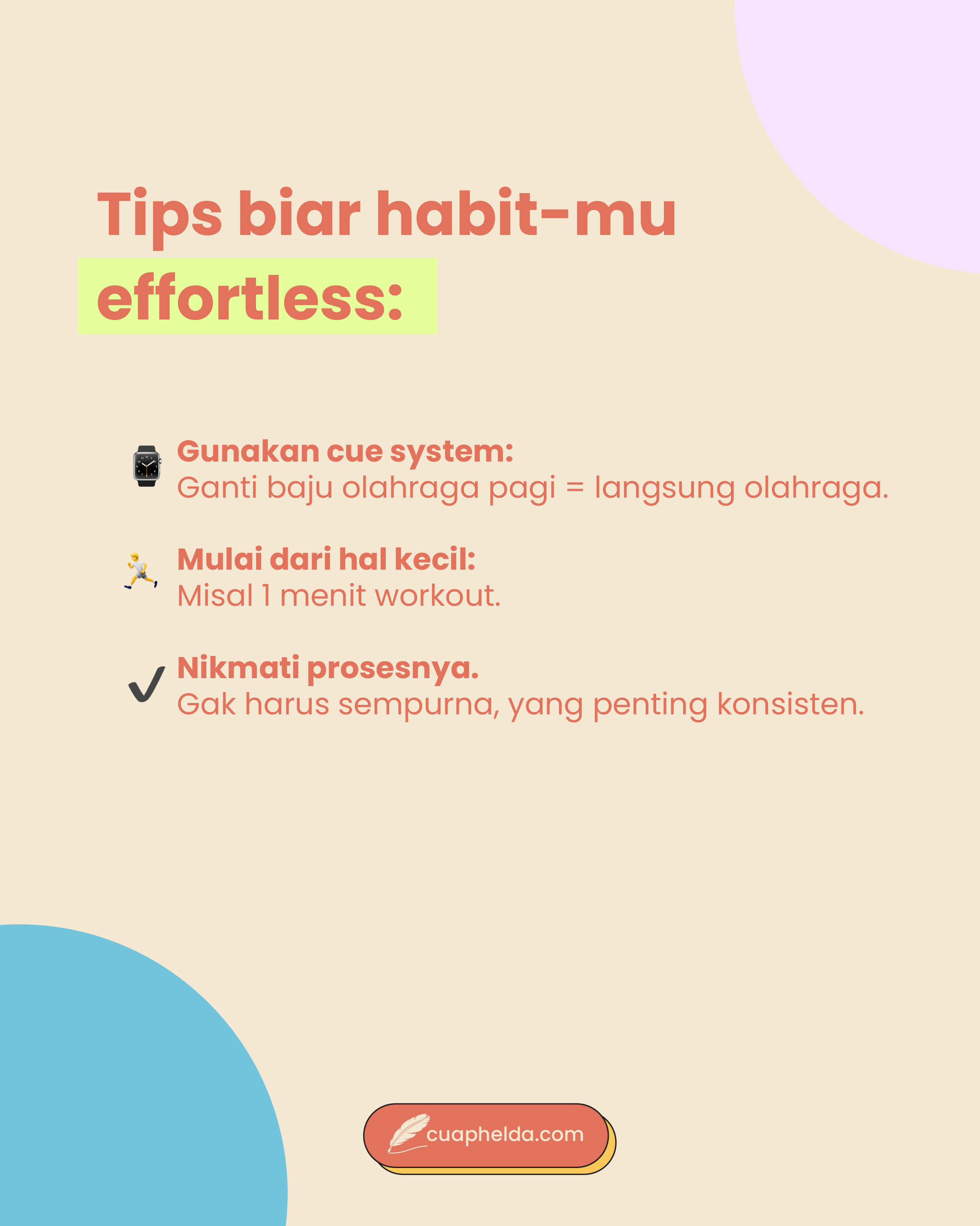 Kalau aku mulai dari olahraga 10 menit, kamu mau mulai kebiasaan kecil apa? Jangan lupa tag aku di Instagram @cuaphelda untuk cerita pengalaman kamu buat building habit!